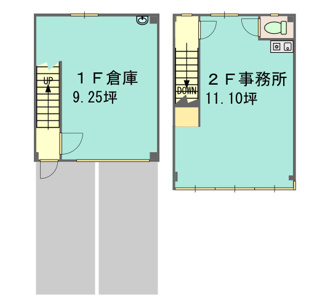 ☆コンパクトオフィス☆ 1階 約9.2坪 2階 約11.1坪 ◇前面駐車可(2台有り)※別料金で台数追加可能 ◇トラック出入り2トン車まで可 ◇倉庫内軽作業等不可